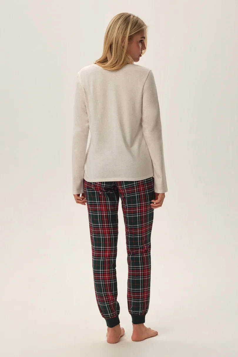 Piżama damska wykonana z delikatnej bawełny. Koszulka z długim rękawem, spodnie długie, wzorzyste. Dekolt okrągły.