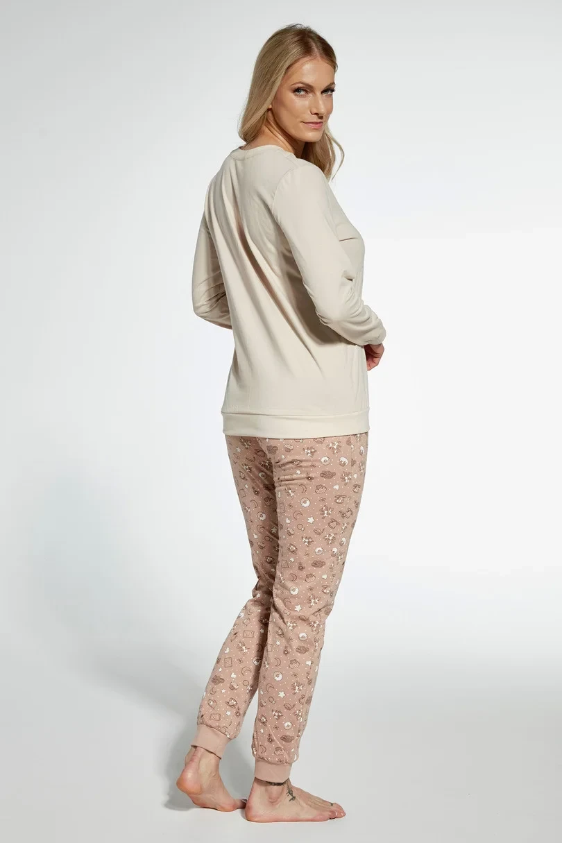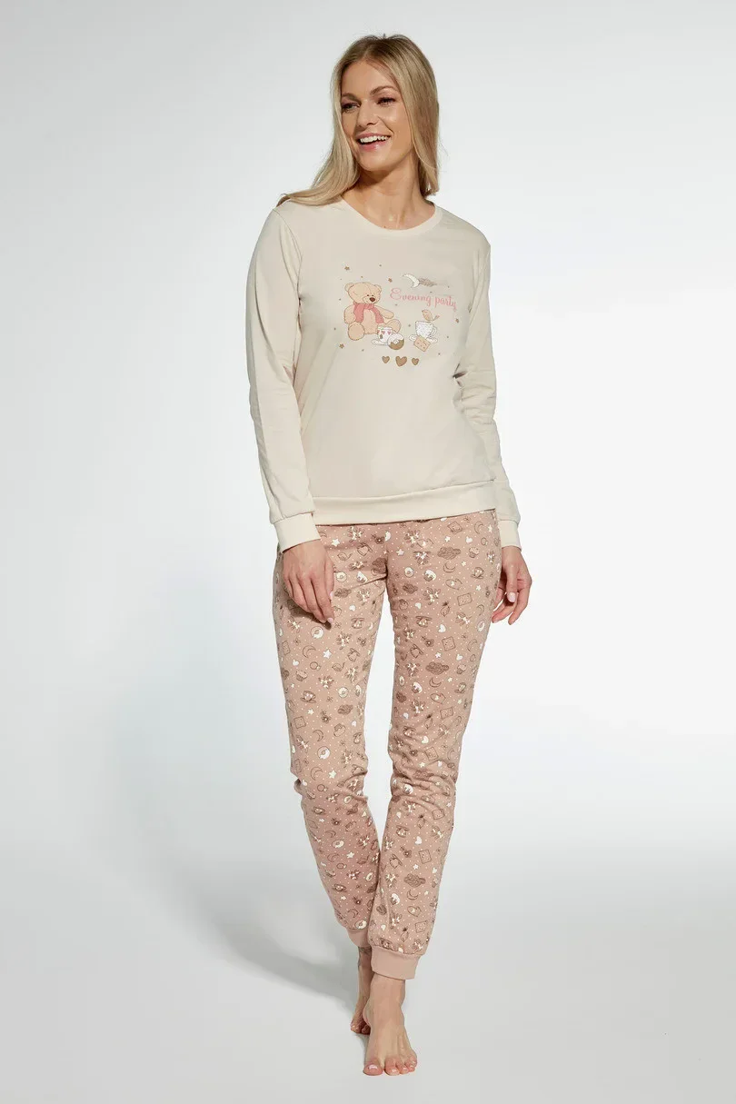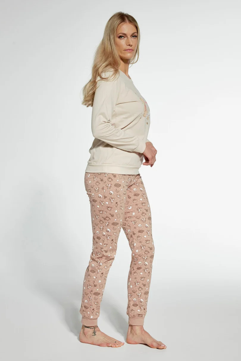 Dámské pyžamo ušité z vysoce kvalitní měkké bavlny. Tričko s dlouhými rukávy, vpředu zdobené barevným potiskem. Doplněno dlouhými vzorovanými kalhotami. Výstřih, manžety a spodní část nohavic košile jsou zakončeny pohodlným žebrovaným lemem. Pyžamo zabalené v krabici.