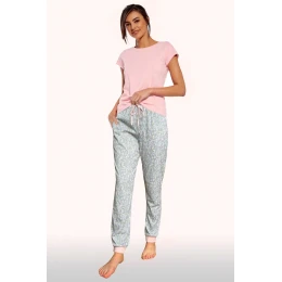 Dámské pyžamo s krátkými rukávy, vyrobené z kvalitní bavlny, kulatý výstřih, dlouhé vzorované kalhoty s žebrovanými nohavicemi a kapsami.