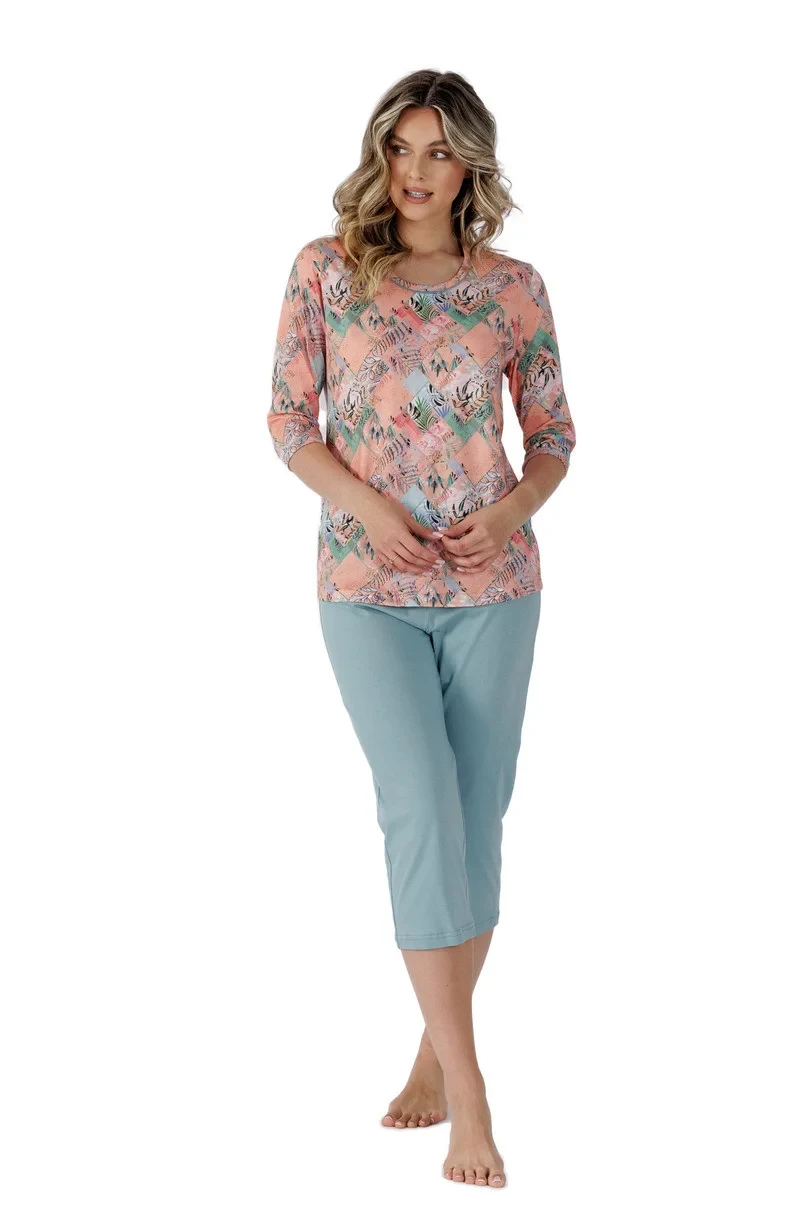 Dámské pyžamo s 3/4 dlouhými rukávy ze vzorované bavlny, kulatý výstřih. Součástí kompletu jsou pevné 3/4 dlouhé kalhoty.
