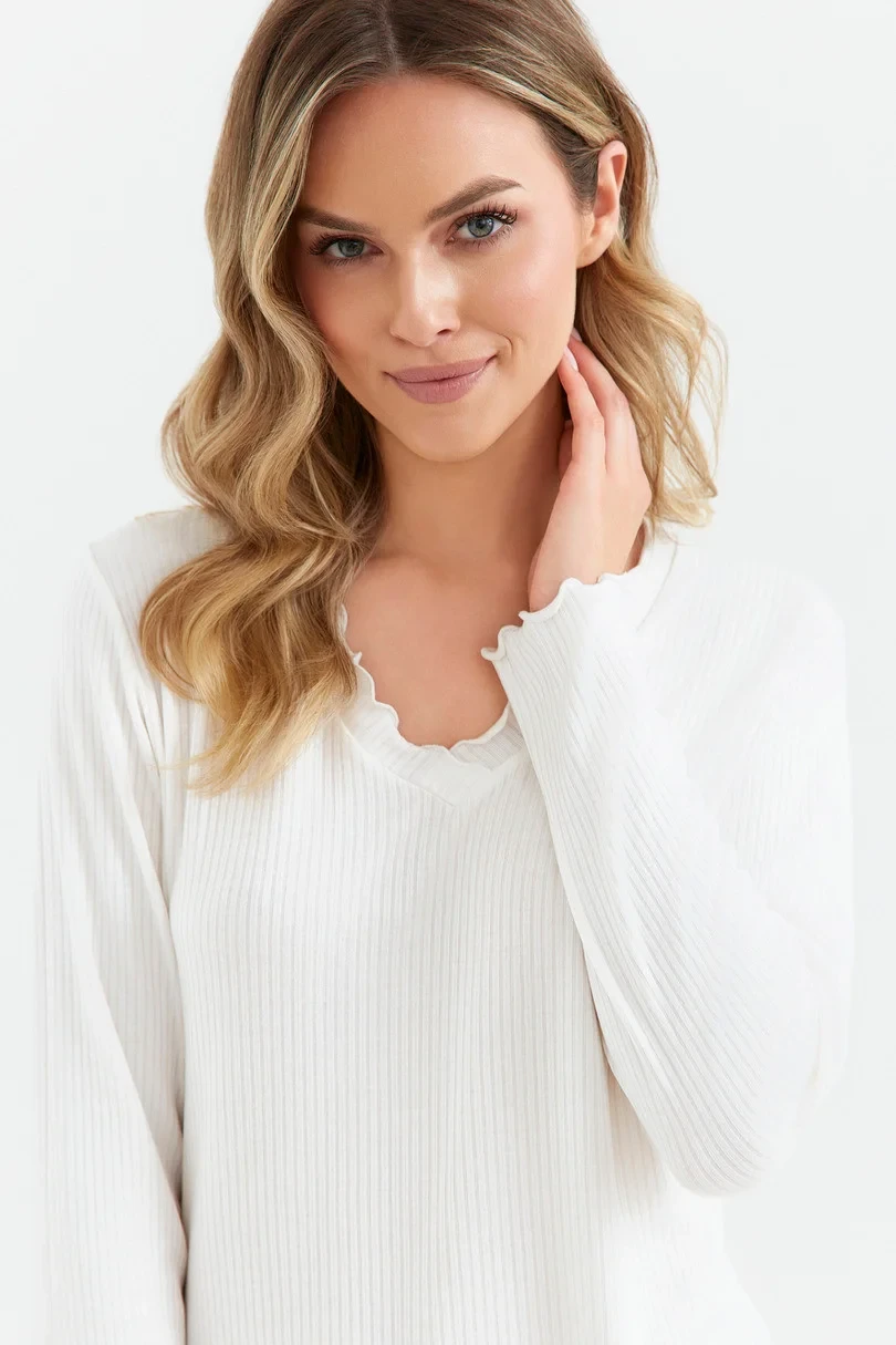trójkątny dekolt i rękawy ozdobione falką z mereżką