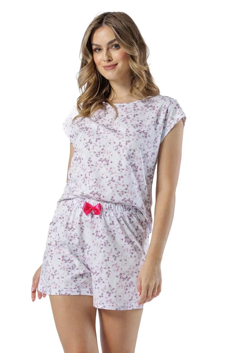 Dámské pyžamo s krátkým rukávem, vyrobené z bavlny s drobnými květy, kulatý výstřih, krátké šortky, ozdobná mašle ve výstřihu.