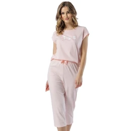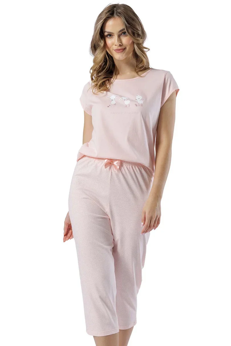 Dámské pyžamo s krátkým rukávem, vyrobené z bavlny, kulatý výstřih, potisk na přední straně, 3/4 dlouhé kalhoty s ozdobnou mašlí v pase.