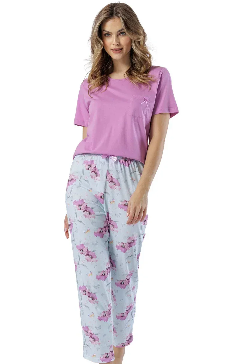 Dámské pyžamo s krátkým rukávem, vyrobené z bavlny, kulatý výstřih, náprsní kapsa, vzorované 7/8 dlouhé kalhoty s ozdobnou mašlí v pase.