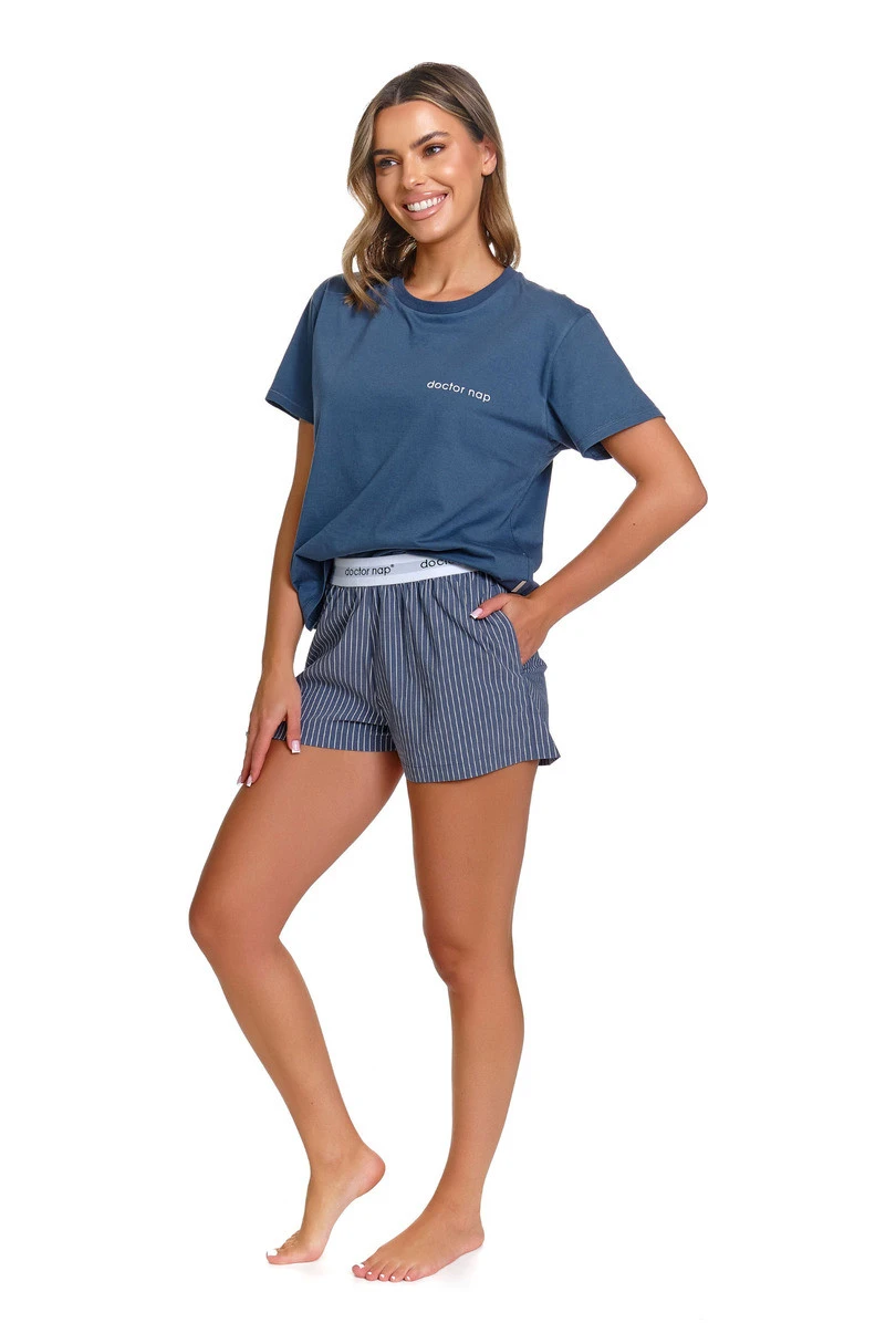 Piżama damska PM.7423 DR NAP w kolorze Denim Blue to połączenie klasycznej formy, sportowej lekkości i nowoczesnego stylu. Wykonana z wysokiej jakości dzianiny (71% bawełna, 26% poliester, 3% elastan), jest miękka, przyjemna dla skóry i komfortowa przez całą noc. T-shirt w odcieniu denim blue z subtelnym logo Doctor Nap posiada swobodny fason, który zapewnia wygodę podczas snu i domowego relaksu. Spodenki w delikatne paseczki nadają całości świeżego, sportowego charakteru. Ozdobna guma w pasie z logotypem Doctor Nap podkreśla nowoczesny design oraz gwarantuje idealne dopasowanie. Dodatkowe kieszonki zwiększają funkcjonalność kompletu. Produkt uszyty w Polsce z dbałością o każdy detal, dostępny również w wersji męskiej – idealny do stworzenia rodzinnego zestawu.