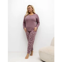 Wymiary piżamy w rozmiarze XL mierzone na płasko: bluzka: szerokość pod pachami - 57 cm, długość rękawa - 58 cm, długość całkowita - 69 cm, szerokość na dole - 56 cm, spodnie: szerokość w pasie - 33 cm (na płasko), szerokość w pasie - 71 cm (po rozciągnięciu), szerokość w biodrach - 61 cm, długość całkowita - 96 cm.