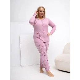 Wymiary piżamy w rozmiarze XL mierzone na płasko: bluzka: szerokość pod pachami - 54 cm, długość rękawa - 62 cm, długość całkowita - 74 cm, szerokość na dole - 52 cm, spodnie: szerokość w pasie - 33 cm (na płasko), szerokość w pasie - 72 cm (po rozciągnięciu), szerokość w biodrach - 57 cm, długość całkowita - 99 cm.
