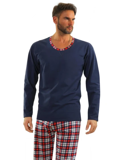 Pánské bavlněné pyžamo . Tričko s dlouhými rukávy doplněné dlouhými kostkovanými kalhotami.