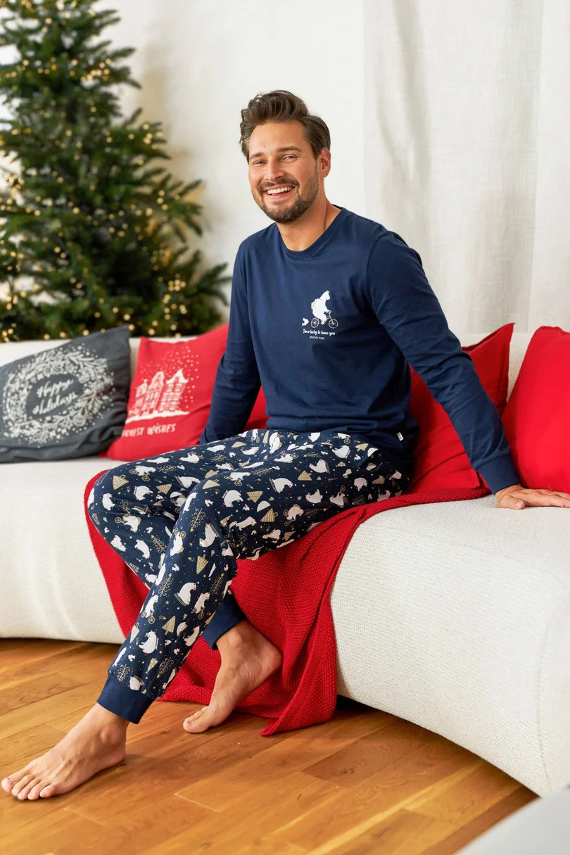 Pánské pyžamo z kvalitní měkké bavlny, tričko s dlouhým rukávem a barevným potiskem na přední straně, dlouhé vzorované kalhoty s pohodlnou šňůrkou v pase, manžetami a spodním lemem.