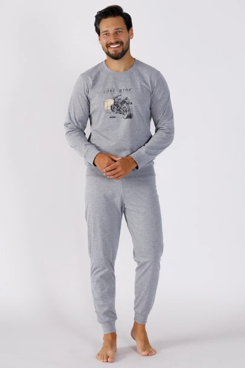 Pánské pyžamo z kvalitní, měkké, melanžové bavlny, tričko s dlouhými rukávy a potiskem na přední straně, dlouhé hladké kalhoty s výstřihem, manžetami a spodním lemem s pohodlnou šňůrkou.