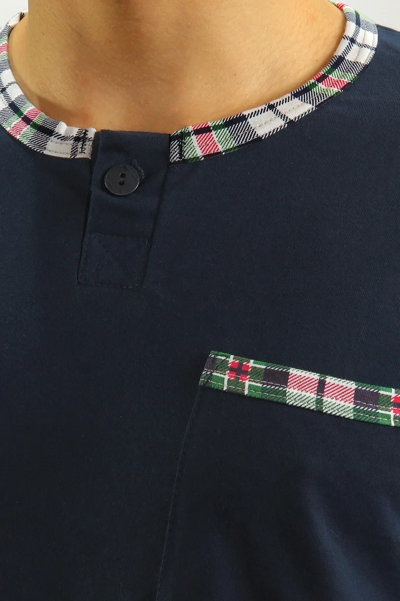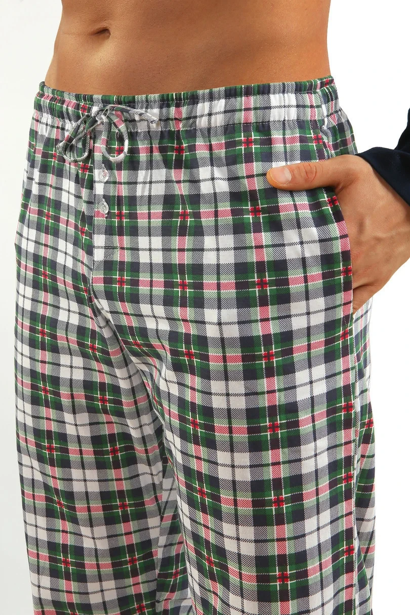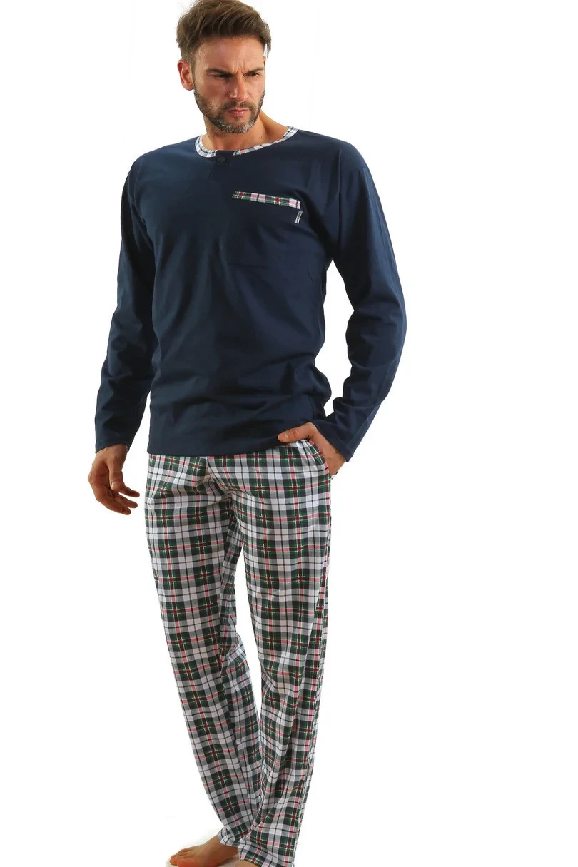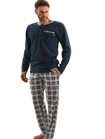 Pánské bavlněné pyžamo . Tričko s dlouhými rukávy doplněné dlouhými kalhotami s kapsami.