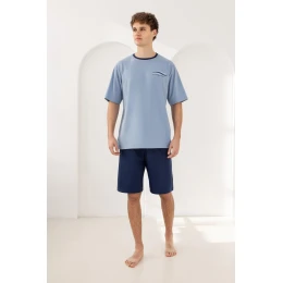 Piżama męska 506 kr/r W26 to połączenie klasycznego stylu, wygody i wysokiej jakości wykonania. Wykonana w 100% z naturalnej bawełny, zapewnia doskonałą przewiewność oraz komfort noszenia przez cały rok. To idealny wybór dla mężczyzn ceniących wygodę, minimalistyczny design oraz staranne wykończenie. Komplet składa się z koszulki z krótkim rękawem i okrągłym dekoltem, który gwarantuje swobodę ruchów i wygodne dopasowanie do sylwetki. Subtelny nadruk na piersi nadaje całości nowoczesnego charakteru. Krótkie, jednolite spodenki wyposażone zostały w elastyczną gumkę w pasie obszytą bawełną, co zapobiega uciskowi i zwiększa komfort podczas snu. Dzięki odpowiedniemu krojowi piżama szczególnie dobrze sprawdzi się u osób szczupłych i wysokich. Naturalny, oddychający materiał sprawia, że komplet doskonale nadaje się zarówno na cieplejsze noce, jak i do całorocznego użytkowania w domu. To doskonała propozycja dla mężczyzn poszukujących wygodnej piżamy bawełnianej w rozmiarach S–XL, która łączy funkcjonalność z ponadczasową estetyką.