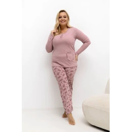 Pyžamo velikosti plus pro ženy je pohodlný, dvoudílný komplet vytvořený s ohledem na plný komfort a ženský styl. Součástí jsou tričko s dlouhým rukávem a dlouhé kalhoty s rovnými nohavicemi. Vrchní část pyžama má kulatý výstřih a tři knoflíky na přední straně, které dodávají jemný dekorativní akcent. Na spodní části trička je praktická kapsa, která přidává trochu funkčnosti a dává celku ležérní charakter. Kalhoty se vyznačují dominantním květinovým vzorem, který přidává kompletu lehkost a ženské kouzlo. Rovné nohavice zajišťují pohodlí a volnost pohybu, ideální jak pro večerní relaxaci, tak pro pohodlný spánek.