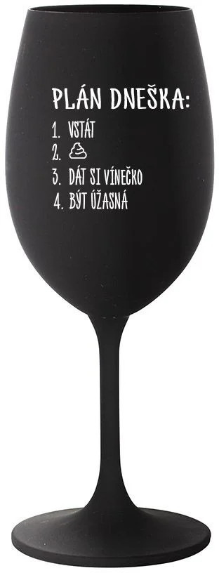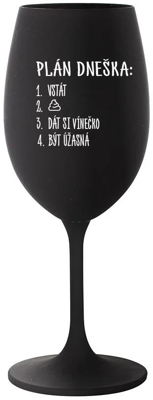 Vinná černá sklenice s originálním motivem PLÁN DNEŠKA - VSTÁT je krásným a osobitým dárkem, které ale využijete i Vy sami třeba ve chvílích, kdy si budete chtít zpříjemnit náročný den. Tyto originální vinné sklenice jsou totiž nejen pro výjimečné události, ale i pro běžné večery, které si chcete zpříjemnit sklenkou dobrého vína. Jistě proto potěší každého milovníka vína, i toho, kdo si umí svůj život vychutnat plnými doušky.