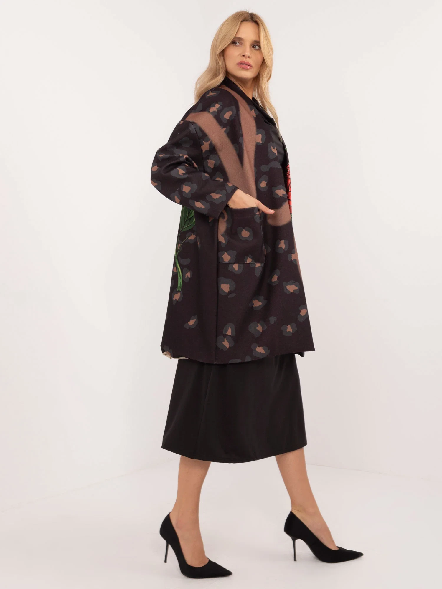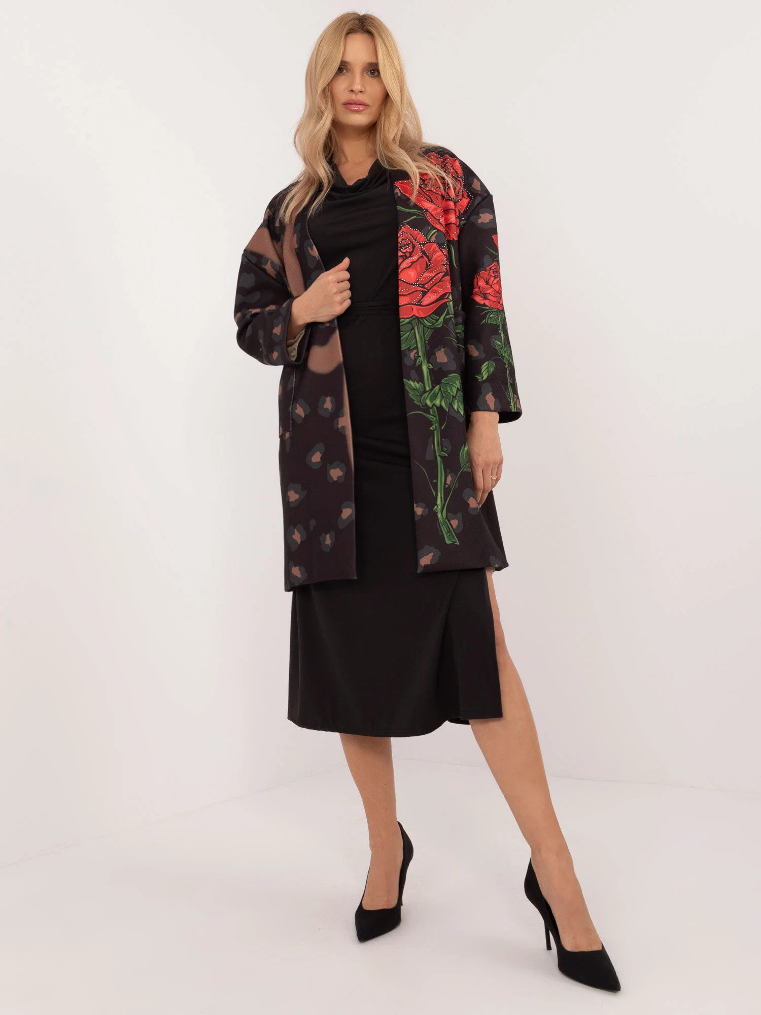 Wymiary płaszcza w rozmiarze one size mierzone na płasko: szerokość pod pachami - 61 cm, długość rękawa - 46 cm, długość całkowita - 91 cm.