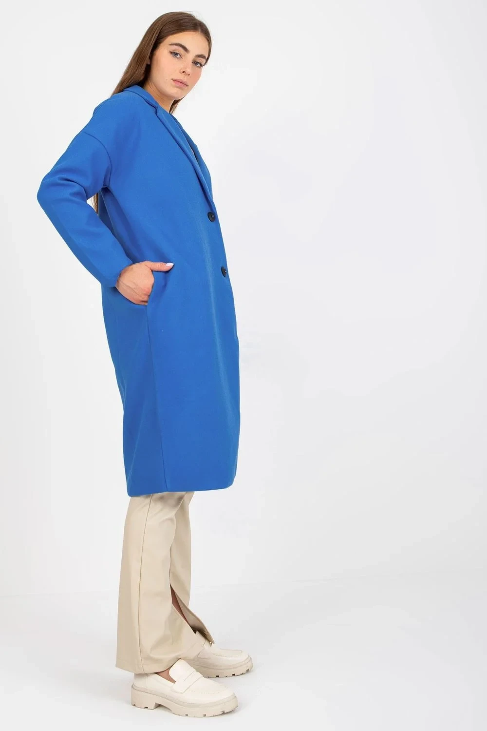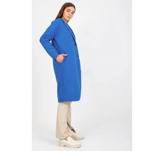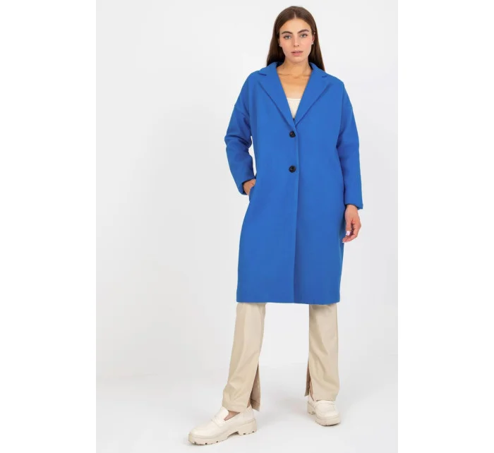 Dámský jednořadový kabát s dlouhými rukávy a zapínáním na knoflíky. Kapsy na bocích. Kabát je plně podšitý.