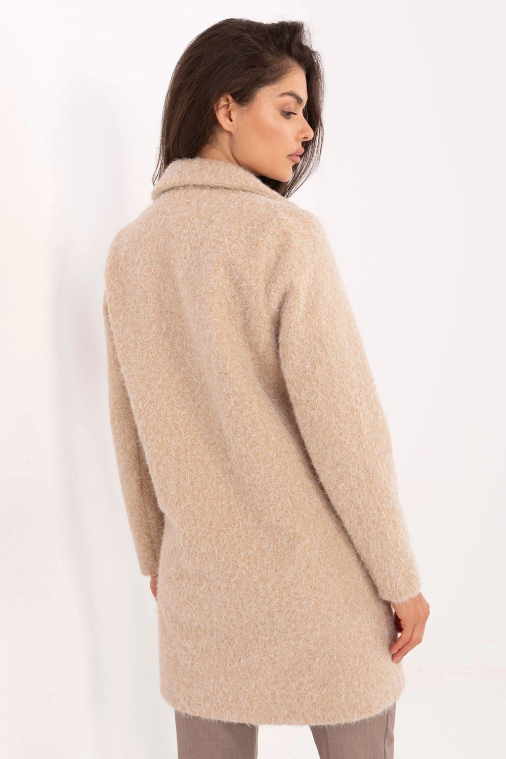 Elegantní dámský přechodný kabát vyrobený z polyesteru s jemným chlupatým efektem, který dodává celku výjimečný šarm a originalitu. Díky různorodé textuře materiálu se vyznačuje mezi klasickými modely, zachovávajíc přitom elegantní a univerzální charakter. Model dlouhý po kolena má dlouhý rukáv a klasické zapínání na knoflík. Pro větší pohodlí je vybaven praktickou podšívkou a vsazenými kapsami, které přidávají funkčnost do každodenního života. Skvěle se hodí do každodenních stylizací a jako elegantní doplněk do práce. Je to skvělá volba na podzim/zimu, v chladných dnech, kdy potřebujete lehké, ale zároveň efektní oblečení bez podsívky.