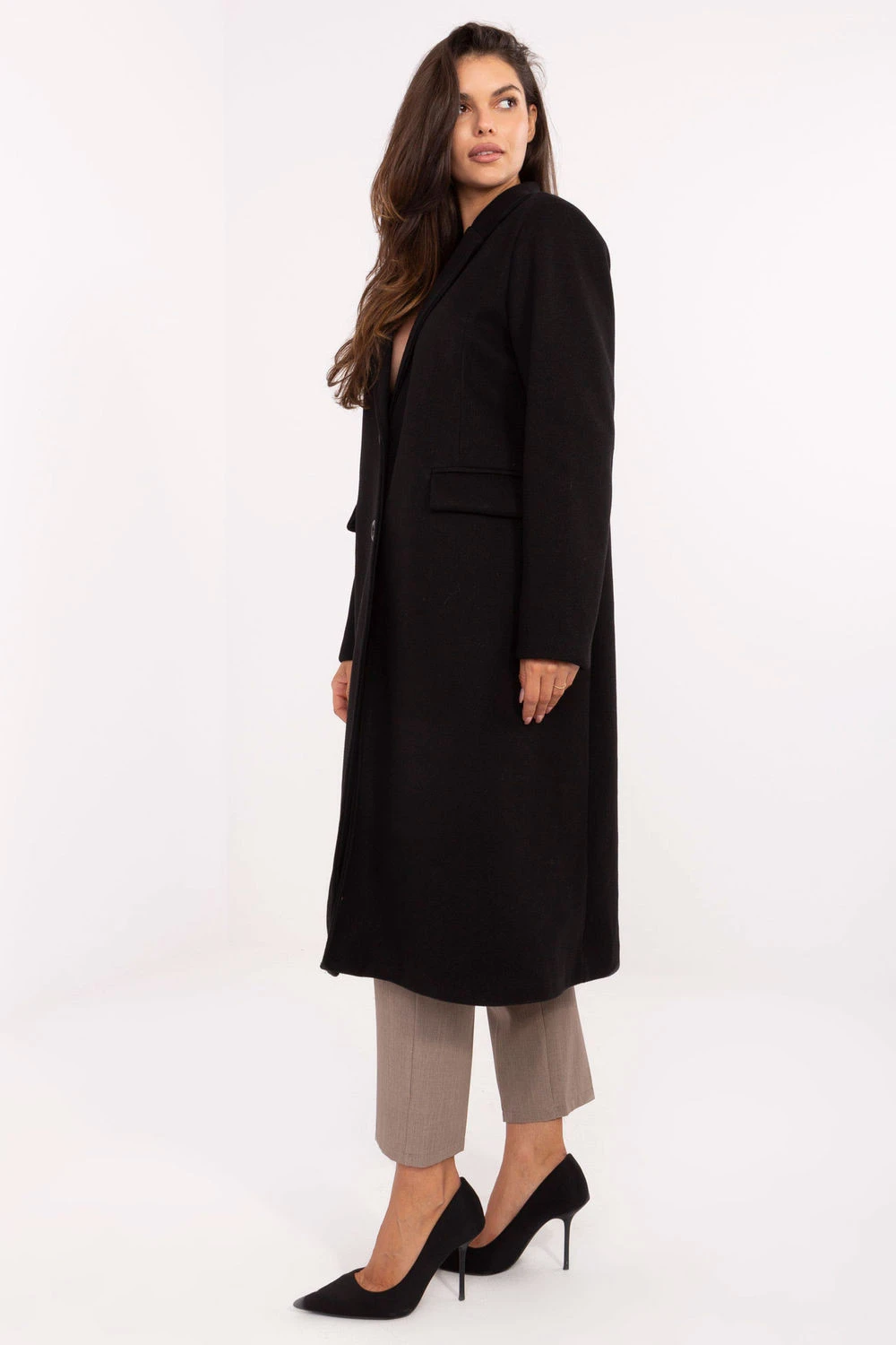 Elegantní dámský kabát s dlouhým střihem je nadčasový model, který se skvěle hodí jak na každý den, tak i do pracovních nebo společenských stylizací. Vyrobený z polyesteru s hladkou strukturou materiálu působí minimalisticky a elegantně, zdůrazňující klasický charakter. Kabát má vestavěné polštářky na ramenou, které dodávají siluetě jasně vyznačenou linii a elegantní střih. Otevíratelné límce a jednořadé zapínání na knoflíky zdůrazňují jeho nadčasový střih. Model je vybaven podšívkou a praktickými kapsami vsunutými pod límce, které dotvářejí celkový dojem. Jedná se o lehký, přechodný kabát, skvělý na podzim, zimu a jaro, ideální volba pro ženy, které oceňují klasiku v moderním provedení.