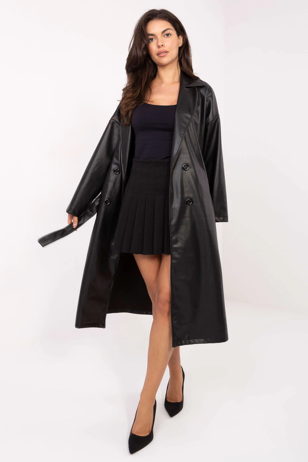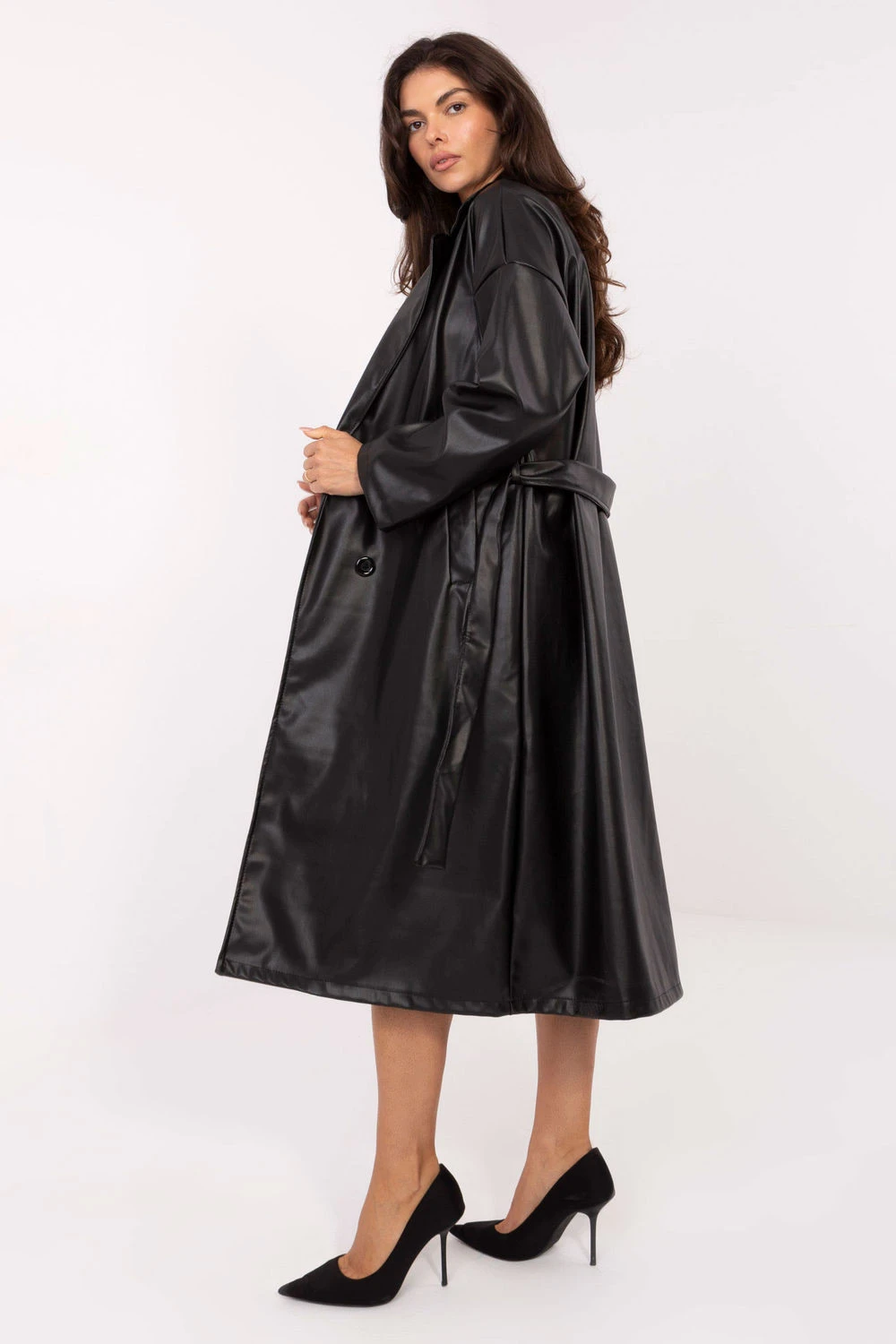 Dámský kožený kabát s nadčasovým, casualovým charakterem, ideální jako přechodné vrchní oblečení na podzim, zimu a jaro. Vyrobený z vysoce kvalitní směsi polyesteru a polyuretanu, vyniká hladkou texturou a elegantním vzhledem. Model dlouhý po kolena byl navržen s důrazem na detaily: má klasické skládané límce, vložené kapsy a dlouhý rukáv. Dvouradé zapínání na knoflíky mu dodává eleganci, a pásek k zavázání v pasu umožňuje zdůraznit postavu a přizpůsobit střih vlastním preferencím. Lehký, bez podšívky, se skvěle hodí do každodenních stylizací, spojuje pohodlí s módním, nadčasovým designem. Jedná se o univerzální kabát, který dodá každému outfitu eleganci.