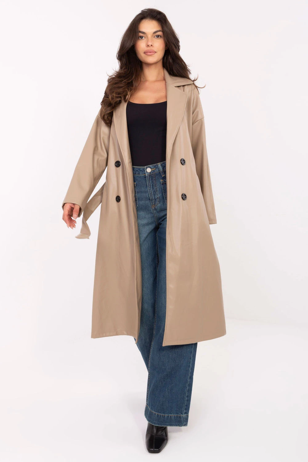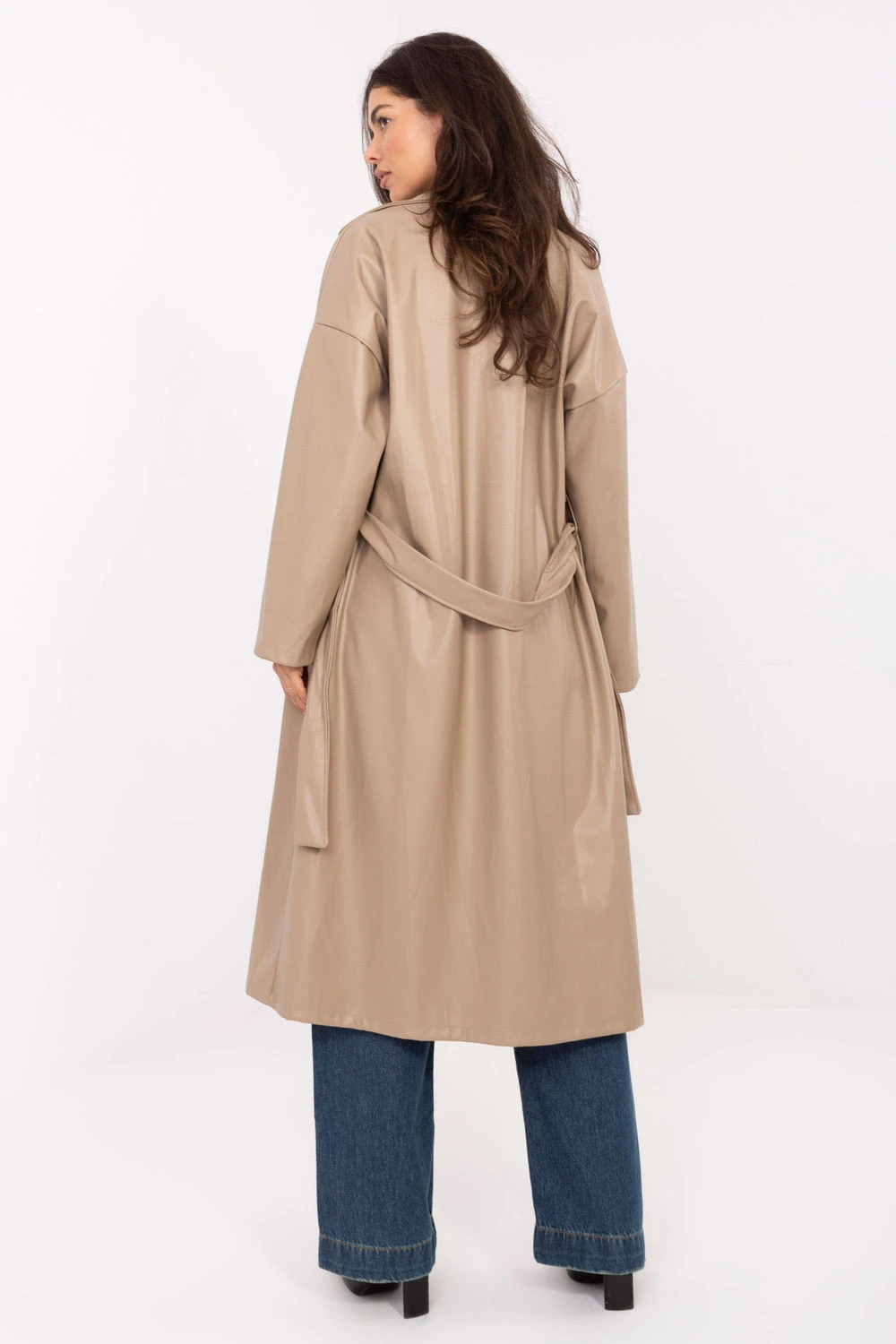 Dámský kožený kabát s nadčasovým, ležérním charakterem, ideální jako přechodný vrchní oděv na podzim, zimu a jaro. Vyrobený z vysoce kvalitní směsi polyesteru a polyuretanu, vyniká hladkou fakturou a elegantním vzhledem. Model po kolena byl navržen s důrazem na detaily: má klasické skládané límce, vsunuté kapsy a dlouhý rukáv. Dvouřadé zapínání na knoflíky mu dodává eleganci, a pásek na uvázání v pase umožňuje zdůraznit postavu a přizpůsobit střih svým preferencím. Lehký, nezateplený, skvěle se hodí do každodenních stylizací, spojuje pohodlí s moderním, nadčasovým designem. Jedná se o univerzální kabát, který přidá eleganci každému outfitu.