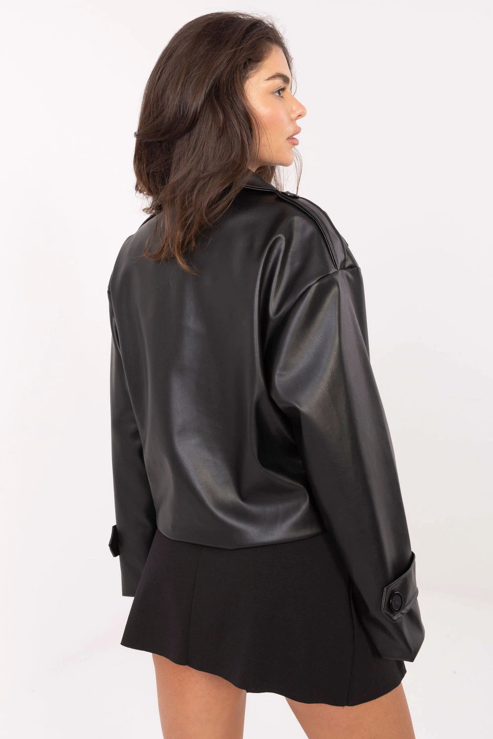 Krátký dámský trenčkot z ekokože je moderní verze klasiky, ideální jako přechodný kabát na podzim, zimu a jaro. Vyrobený z vysoce kvalitní směsi polyesteru a polyuretanu, vyniká hladkou fakturou a elegantním, ale zároveň casual stylem, skvělým pro každodenní stylizace. Model byl navržen s velkým límcem a širokými límci, které mu dodávají charakter. Dvojřadé zapínání na knoflíky zdůrazňuje klasický střih, a náramky na ramenou přidávají vojenský nádech typický pro trenčkot. Kabát má také podšívku, co zvyšuje pohodlí nošení a dělá celkový vzhled mimořádně pečlivým. Krátká délka a jednoduchý střih dělají z tohoto modelu univerzální kousek šatníku, ideální pro každodenní, městské stylizace s nádechem elegance.