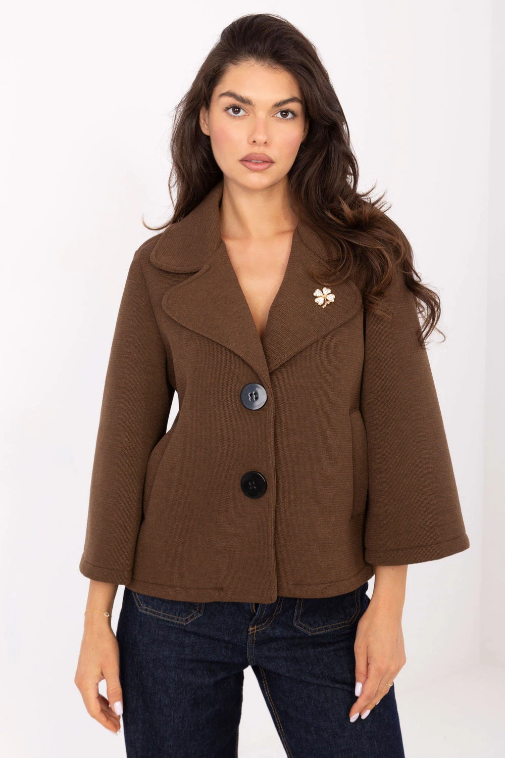 Krátký dámský kabátek s elegantním charakterem, ideální na přechodné období podzim, zima a jaro. Vyrobený z vysoce kvalitní směsi polyesteru, viskózy a elastanu, vyniká hladkou strukturou a pohodlností nošení. Model s límci, zapínán jednořadě na knoflíky, má praktické kapsy. 3/4 rukávy dodávají lehkost a ozdobná brož na límci zdůrazňuje elegantní styl. Bez podšívky, skvěle se hodí do každodenních i kancelářských outfitů.