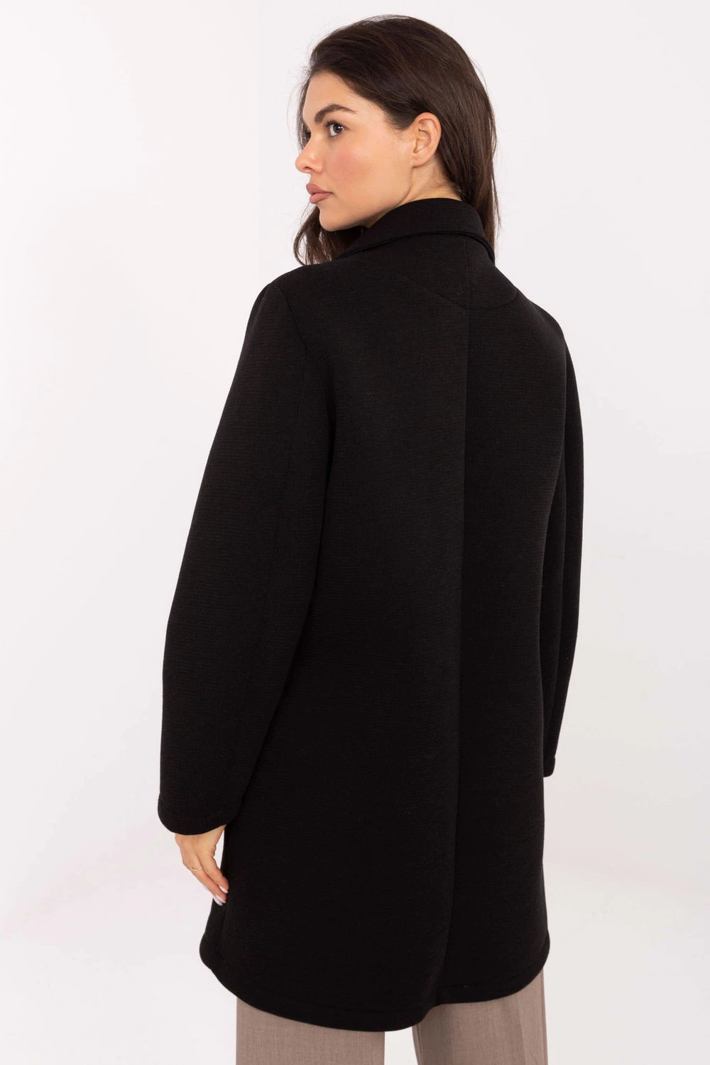 Elegantní dámský kabát vyrobený z moderní pěnové látky, ideální na přechodnou sezónu podzim, zimu a jaro. Vyrobený z polyesteru, viskózy a elastanu, zachycuje hladkou strukturu a odolnost. Model standardní délky s límci, zapínání na knoflíky, má dlouhé rukávy a praktické kapsy. Stylovým akcentem je ozdobná brož na límci, která dodává celku jedinečný charakter. Lehký a nevytápěný, skvěle se hodí do každodenních i kancelářských stylizací.