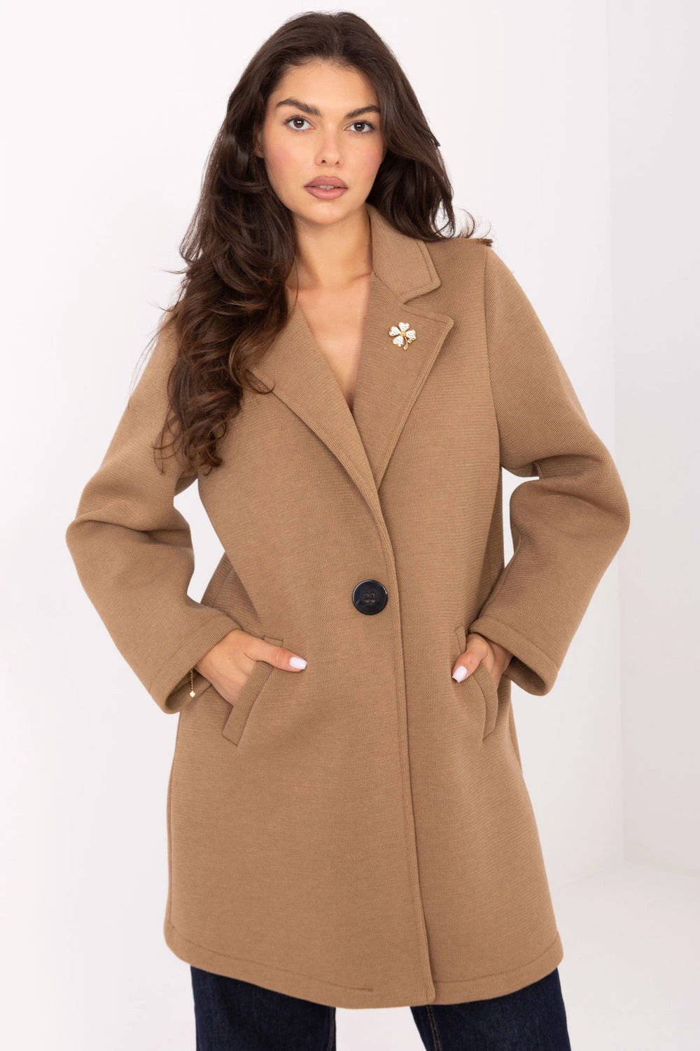 Elegantní dámský kabát vyrobený z moderní pěnové látky, ideální na přechodné období podzim, zimu a jaro. Vyrobena z polyesteru, viskózy a elastanu, ohromuje hladkou strukturou a odolností. Model standardní délky s límci, zapínáním na knoflíky, dlouhými rukávy a praktickými kapsami. Stylovým doplňkem je ozdobná brož na límci, která dodává celku jedinečný charakter. Lehký a nezateplený, skvěle se hodí do každodenních i pracovních stylizací.