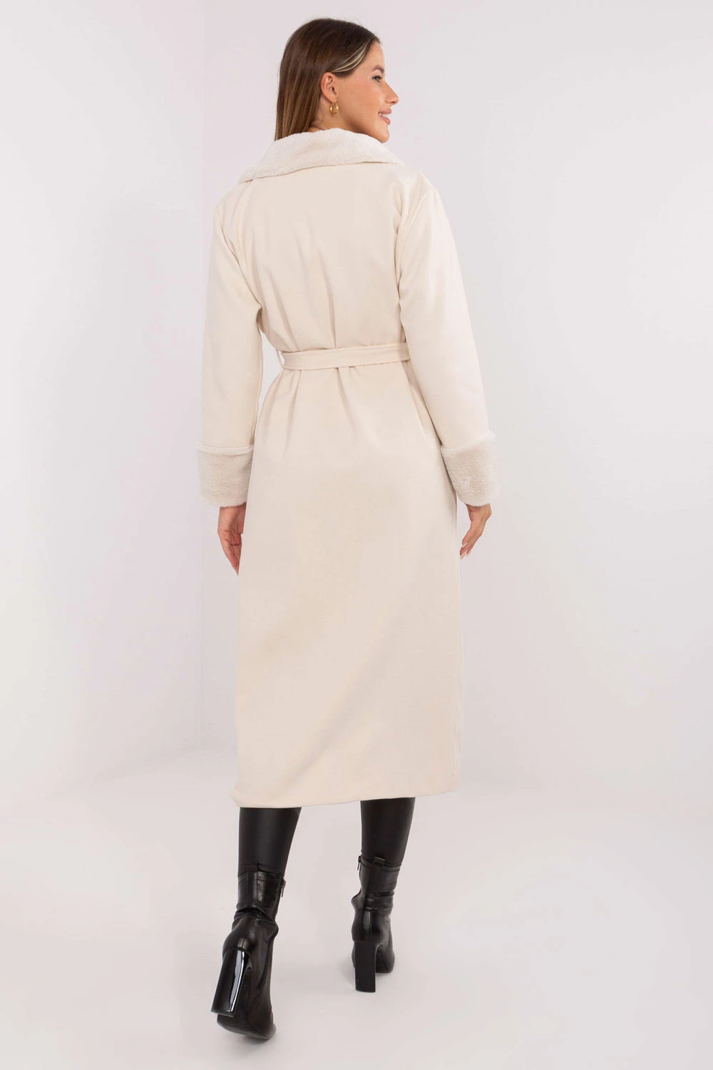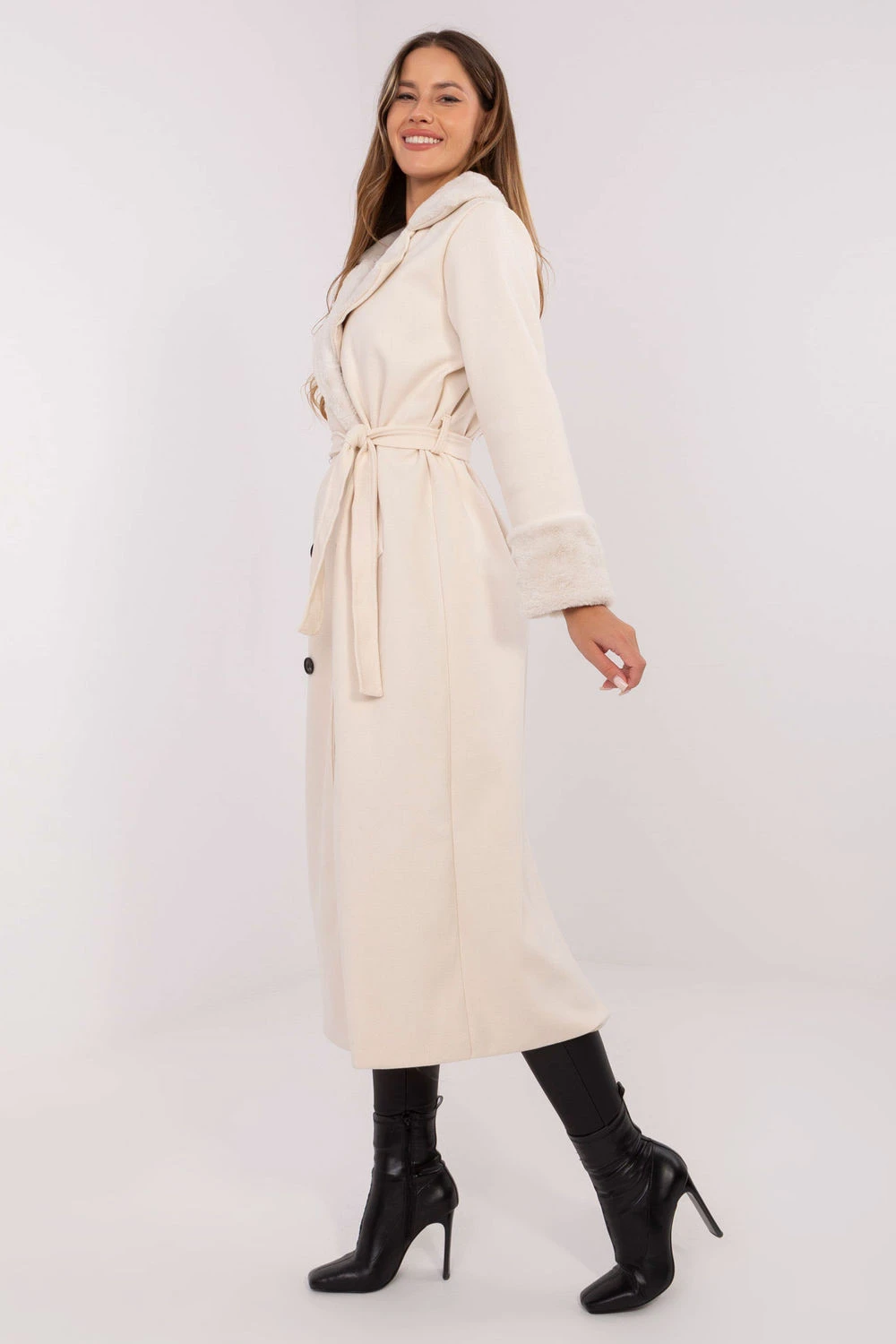 Dlouhý zimní dámský kabát spojující eleganci s funkcionalitou, ideální na každý den, do práce a na společenské události. Vyroben z polyesteru s přídavkem elastanu, co zajišťuje lehkost, odolnost a pohodlí při nošení. Model je hladký, podsazený měkkým kožíškem a podšívkou, díky čemuž skvěle chrání před chladem a zachovává elegantní vzhled. Zapínání na dvojité knoflíky a pásek k přivázání umožňují přizpůsobení siluety, a praktické kapsy zvyšují funkčnost kabátu. Je to klasická volba pro ženy, které si váží stylu, pohodlí a všestrannosti, skvěle se hodí jak do každodenních, tak do formálních stylizací.