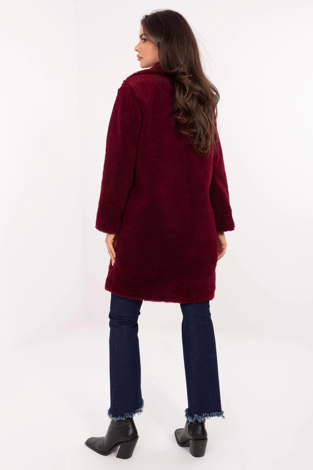 Dámský kabát ze syntetického beránka je ideální volbou na chladné podzimní a zimní dny. Vyrobený z měkkého polyesteru s různorodou fakturou, potěší příjemným omakem a stylovým vzhledem. Károvaný límec s velkými skládanými límci mu dodává eleganci a zároveň zdůrazňuje jeho ležérní, městský charakter. Model dlouhý po kolena skvěle vypadá na postavě a volný střih zaručuje pohodlí nošení a možnost nasadit svetr pod něj. Zapínání na jednořadé knoflíky dodává klasický šarm, zatímco vložené kapsy jsou praktickým prvkem každodenního používání. Kabát má podšívku, díky čemuž se dobře drží a zvyšuje pohodlí nošení, i když není s dodatečným zateplením.