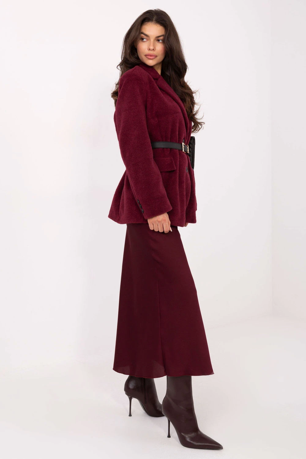 Elegantní dámský kabát boucle ve střihu saka je ideální volbou na podzim/zimu. Vyrobený z příjemného na dotek materiálu s charakteristickou strukturou boucle, vypadá velmi elegantně a zároveň je pohodlný na nošení. Model má skládané límce a zapínání na knoflíky, co podtrhuje jeho klasický, nadčasový charakter. Standardní délka a dlouhý rukáv z něj činí skvělý doplněk jak k elegantním outfitům, tak k běžným kombinacím. Vnitřní podšívka zajišťuje pohodlí a estetické provedení. Kabát není vyztužen, takže se skvěle hodí jako přechodný kabát, ideální na chladnější podzimní a brzké zimní dny. Je to skvělá volba na každý den, do práce nebo na slavnostní příležitosti, dodá každému outfitu eleganci.