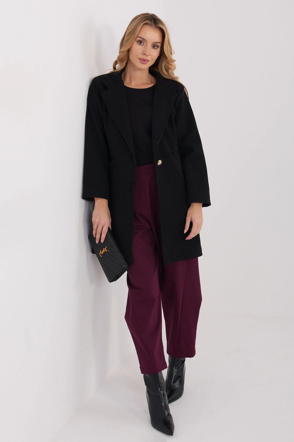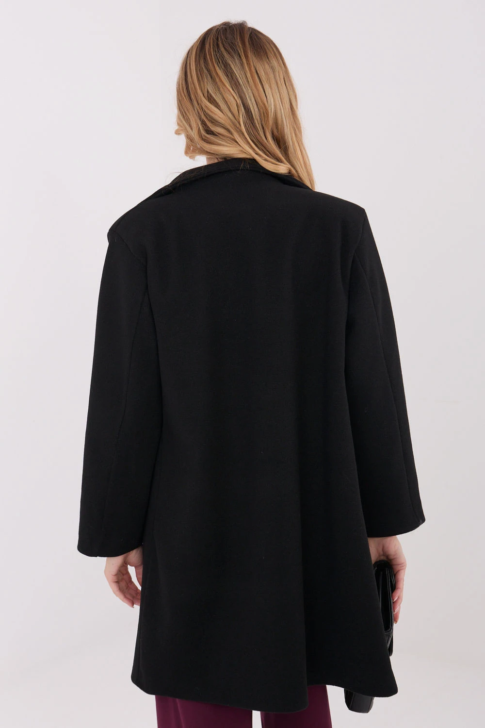 Elegantní dámský přechodný kabát je stylovou a univerzální nabídkou ideální na podzim, zimu a jaro. Jeho klasický střih s límci dodává kabátu nadčasový charakter, díky čemuž se skvěle hodí na každý den, do práce, ale i na slavnostní příležitosti. Model vyrobený z kombinace polyesteru a viskózy zaručuje pohodlí nošení, odolnost a elegantní vzhled materiálu. Hladký, dominující vzor umožňuje snadné sladění kabátu s různými stylizacemi, od každodenních až po formální. Kabát má krátkou délku, která mu dodává moderní charakter, a dlouhý rukáv zajišťuje pohodlí a ochranu v chladnějších dnech. Absence podšívky z něj dělá ideální přechodný kabát, lehký a vhodný na proměnlivé počasí. Na přední straně jsou vsunuté kapsy, praktické a elegantní zároveň, a celkový dojem dotváří zapínání na knoflíky v jednom řádku, zdůrazňující klasický styl modelu. Tento kabát je skvělou volbou pro ženy, které oceňují eleganci, pohodlí a nadčasovou jednoduchost v moderním provedení.