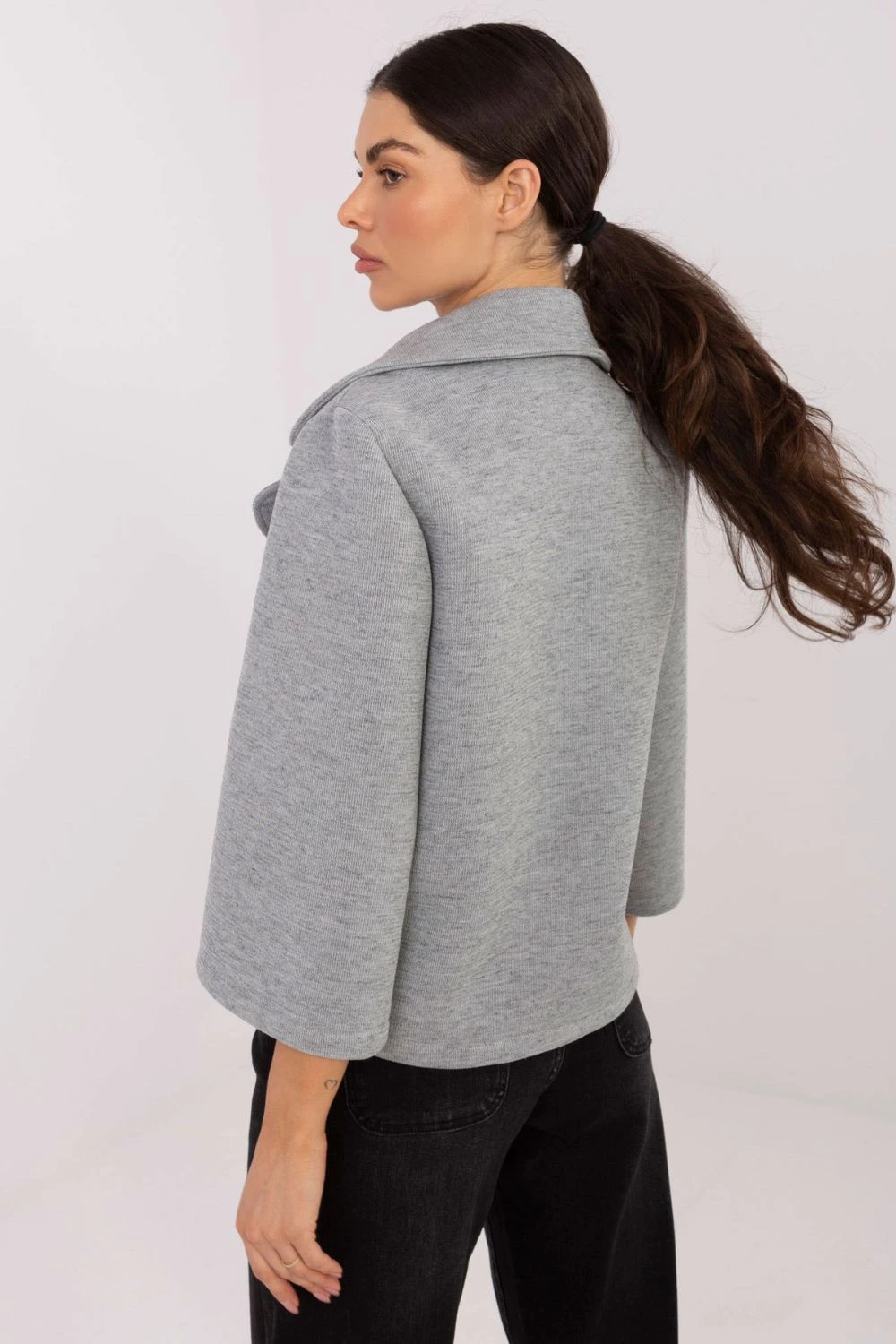 Krátký elegantní dámský kabát, ideální na přechodnou sezónu podzim, zimu a jaro. Vyrobený z kvalitní směsi polyesteru, viskózy a elastanu, vyznačuje se hladkou strukturou a pohodlným nošením. Model s límci, zapínání na jedno tlačítko, má praktické kapsy. 3/4 rukávy dodávají lehkost a ozdobná brož na límci zdůrazňuje elegantní styl. Bez podšívky, skvěle se hodí do každodenního i kancelářského stylu.