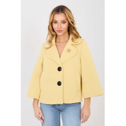 Elegantní dámský přechodný kabát vyrobený z moderního pěnového materiálu je stylovou nabídkou na podzim, zimu a jaro. Šitý z vysoce kvalitního polyesteru a elastanu zajistí pohodlí nošení, lehkost a estetické přizpůsobení postavě. Model s krátkou délkou a hladkým vzorem se skvěle hodí jak do každodenních stylizací, tak do práce. Rukáv o délce 3/4 dodává kabátu jemnou eleganci a lehkost. Jednořadé zapínání na knoflíky zdůrazňuje klasický charakter střihu. Kabát nemá žádné podšívky ani výplně, což ho činí ideálním jako přechodový kousek. Praktické kapsy zvyšují funkčnost a ozdobná brož dodává elegantní akcent, který doplňuje celkový vzhled.