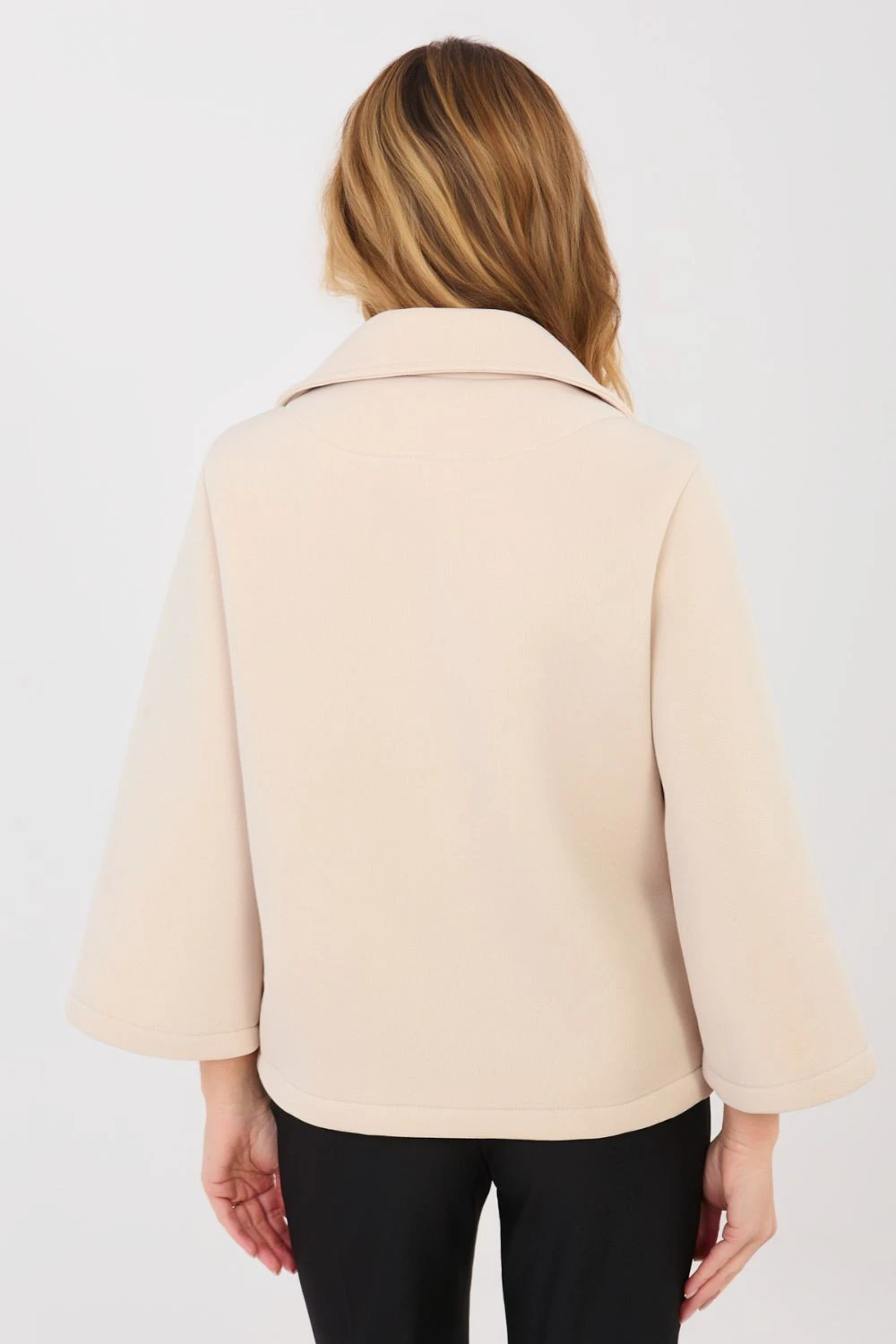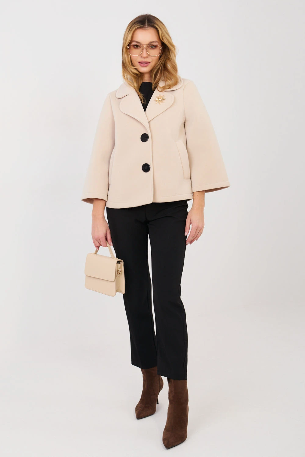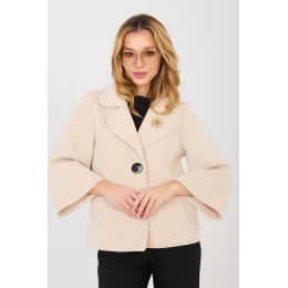 Elegantní dámský přechodný kabát vyrobený z moderního materiálu pěnové hmoty je stylovým návrhem na podzim, zimu a jaro. Šitý z vysoké kvality kombinace polyesteru a elastanu, poskytuje pohodlí, lehkost a estetické přizpůsobení postavě. Model s krátkou délkou a hladkým vzorem se skvěle hodí jak do každodenních stylizací, tak do práce. Rukáv o délce 3/4 dodává kabátu jemnou eleganci a lehkost. Jednořadé zapínání na knoflíky zdůrazňuje klasický charakter střihu. Kabát nemá žádnou podšívku ani výplň, díky čemuž je ideální jako přechodový oděv. Praktické kapsy zvyšují funkčnost a ozdobná brož dodává elegantní akcent, který dokonale doplňuje celkový vzhled.