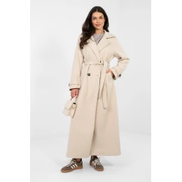 Dlouhý dámský kabát je elegantní nabídkou na přechodnou sezónu podzim, zima a jaro. Vyrobený z vysoce kvalitního polyesteru, v klasickém hladkém vzoru, kombinuje styl a funkcionalitu. Model s límci, širokým límcem a dvouřadým zapínáním na knoflíky zdůrazňuje elegantní charakter každé stylizace. Kabát má vsazené kapsy, pásek k uvázání v pasu a podšívku, což zajišťuje pohodlí a komfort při nošení. Skvěle se hodí jak do každodenních, společenských, tak i do pracovních stylizací, přidávající eleganci a třídu každé ženě.