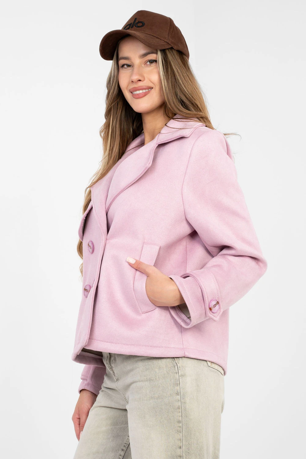 Zamšový přechodný dámský kabát je stylovým návrhem v casualovém provedení, ideálním na každý den. Skvěle se hodí do podzimní, zimní a jarní sezóny jako lehká vrchní vrstva, která podtrhuje charakter každého outfitu. Model s krátkou délkou je vyroben z příjemného materiálu na bázi polyesteru s přídavkem elastanu. Hladká faktura mu dodává elegantní jednoduchost a jemně elastická tkanina zajišťuje pohodlné nošení a volnost pohybu. Kabát nemá žádné podšívky ani výplně, což ho činí ideální volbou pro přechodné období. Dvouřadé zapínání na knoflíky zdůrazňuje klasický střih, a límec s otočenými límci dodává celku eleganci. Dlouhý rukáv ozdobený páskem s knoflíkem je decentní, stylový detail. Praktické kapsy zvyšují funkčnost modelu. Jedná se o univerzální kabát, který se snadno sladí jak s džíny a kozačkami, tak s elegantnějšími každodenními outfity.