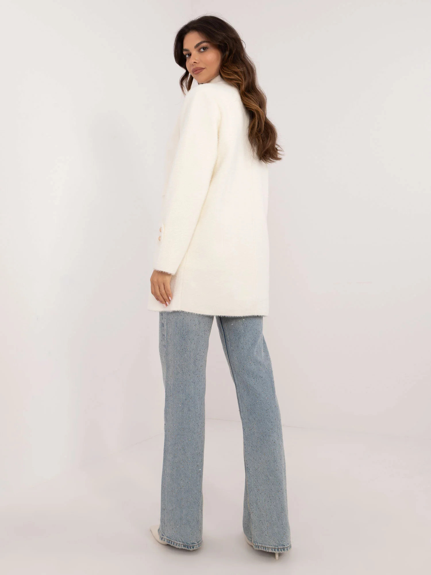 Wymiary płaszcza w rozmiarze one size mierzone na płasko: szerokość pod pachami - 58 cm, długość całkowita - 78 cm, długość rękawa - 57 cm