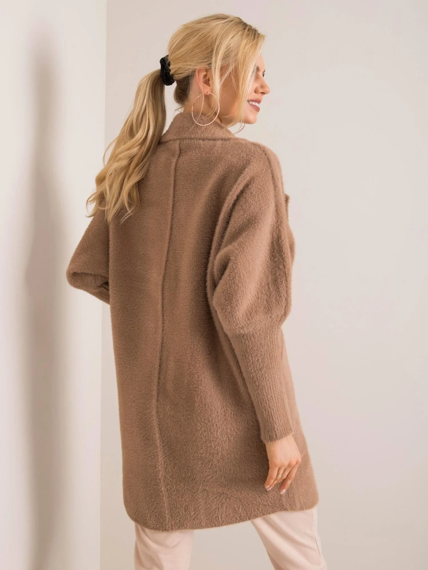 Ciemnobeżowy płaszcz alpaka fluffy.