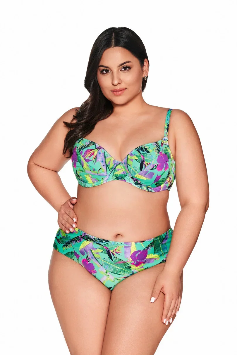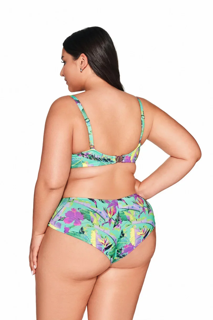 Spodní díl brazilského střihu smyslně odhaluje hýždě a jemně zdůrazňuje ženské křivky. Je vyroben z vysoce kvalitní elastické tkaniny (80 % polyamid, 20 % elastan), dokonale se přizpůsobí postavě a zajistí pohodlí a volnost pohybu. Díky tropickému potisku a lehkému lesku tkaniny působí spodní díl stylově a moderně.
