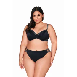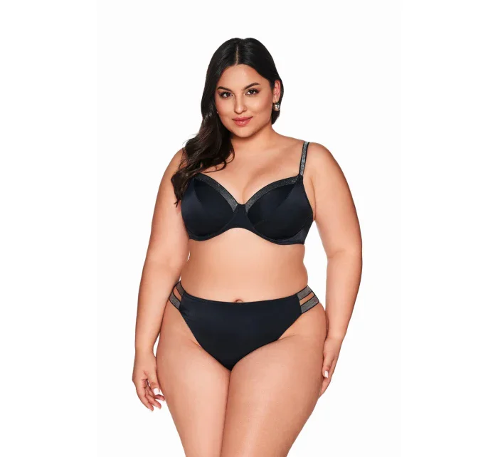 Dodaj swojej plażowej stylizacji nuty zmysłowości i luksusu dzięki figom kąpielowym typu brazyliany z ozdobnymi paskami po bokach. Gładka, czarna tkanina w połączeniu z delikatnie połyskującymi detalami tworzy elegancki, a zarazem kobiecy efekt.