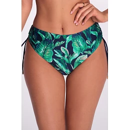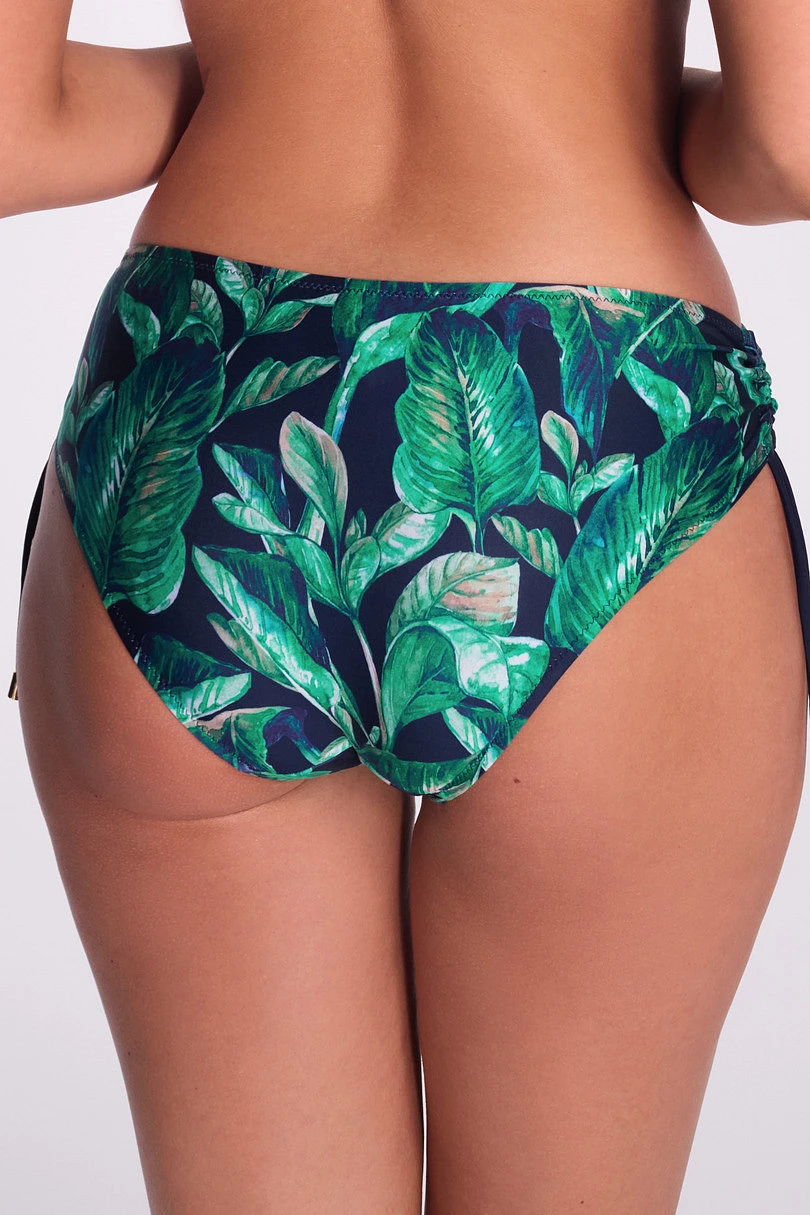Figi kąpielowe SF 235/2 Leafine od AVA Swimwear to wyjątkowe połączenie kobiecej zmysłowości i funkcjonalności. Tropikalny nadruk w intensywnych odcieniach zieleni na granatowym tle przyciąga wzrok, podkreślając opaleniznę i nadając sylwetce świeżego wyglądu. Regulowane troczki po bokach pozwalają dostosować wysokość i stopień zakrycia, co sprawia, że figi idealnie dopasowują się do kształtów każdej kobiety. Dodatkowe marszczenia subtelnie wysmuklają biodra i dodają lekkości. Wysokiej jakości materiał zapewnia trwałość oraz komfort noszenia zarówno na plaży, jak i na basenie. Doskonały wybór w duecie z biustonoszem SK 235 – razem tworzą modny i wygodny komplet kąpielowy.