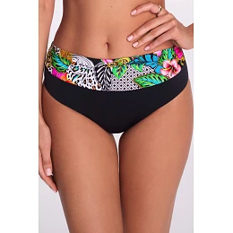 Spodní díl bikin SF 237/3 Royal Wild od značky AVA Swimwear je ideální volbou pro ženy, které chtějí klasický střih s moderním exotickým nádechem. Model plnějšího střihu se dokonale přizpůsobí tělu a poskytuje pohodlí a jistotu při opalování i ve vodě. Široký vzorovaný pás s tropicko-geometrickým potiskem krásně zvýrazňuje pas a dodává stylingu výraznost, zatímco hladký černý spodní díl opticky zeštíhluje boky. Elastická, rychleschnoucí tkanina zaručuje pohodlí a odolnost po mnoho sezón. Spodní díl bikin SF 237/3 se dokonale kombinuje s podprsenkami Royal Wild a vytváří tak ucelený, výrazný plážový komplet.