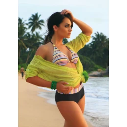 Dvoudílné bikiny s šortkami jsou součástí balení. Barevný pruhovaný model, prázdninový, lehce sportovní, ideální na plavání nebo opalování. Podprsenka se zavazovacími ramínky a zavazovacím lemem, velmi pohodlná, vyztužené košíčky s vyjímatelnými vycpávkami. Řemínky s jemnými bižuterními akcenty. Hladké šortky s ozdobným lemováním. Složení: 82 % polyamid, 18 % elastan.