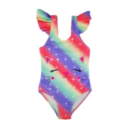 Dívčí jednodílné plavky, barevné. Ramínka zdobená volánkem, rychleschnoucí tkanina.