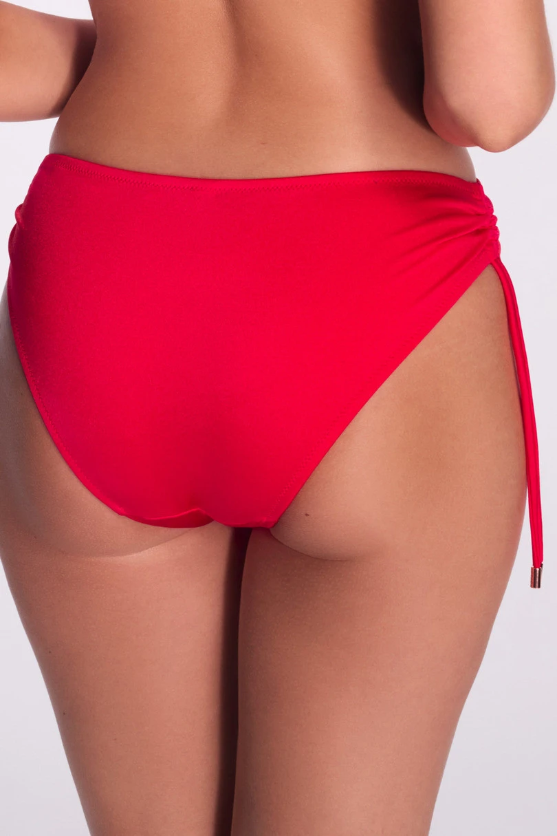 Model wyróżniają regulowane troczki po bokach, które umożliwiają dowolne dopasowanie wysokości wycięcia – od klasycznego zakrycia po bardziej zmysłowy, odsłaniający krój. Delikatne marszczenia po bokach dodają figom kobiecego charakteru, a intensywnie czerwony kolor Scarlet przyciąga spojrzenia i pięknie podkreśla opaleniznę. To idealny wybór na lato 2026 dla kobiet ceniących wygodę, styl i możliwość personalizacji.