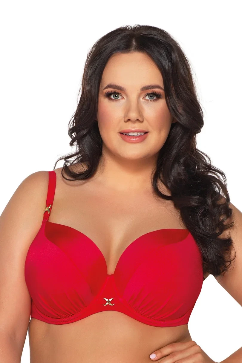 Energetyczna czerwień idealnie współgra z letnią opalenizną! Dzianina ze skrzącym połyskiem wzbogacona o złote dodatki podkreśli koloryt skóry i rozświetli plażowy outfit. Pełne miski biustonosza full cup solidnie zbiorą i podtrzymają nawet najbardziej niesforny biust, a delikatne marszczenia dodatkowo wizualnie zaokrąglą biust. Do kompletu dobierz koniecznie wielofunkcyjne figi kąpielowe SF 180/2 z regulującymi wysokość boczków troczkami.