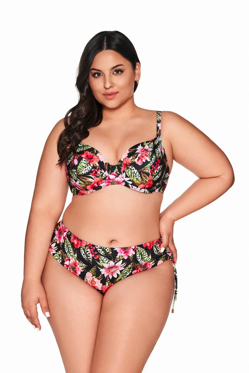 Plavky SK 218 FULL CUP jsou ideální volbou pro ženy, které ocení styl i pohodlí. Květinový vzor na černém pozadí připomíná rajskou zahradu plnou červených a růžových barev a vystihuje tropický charakter kostýmku.