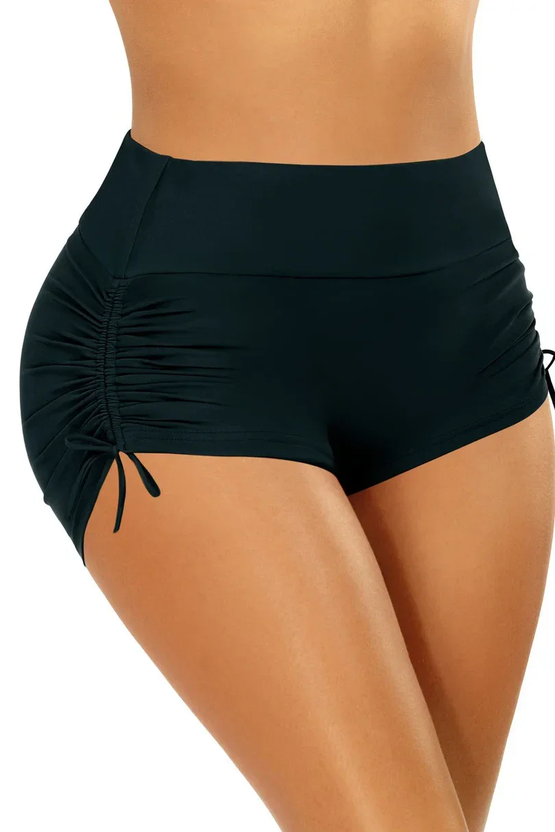Šortky jsou dokonalou kombinací stylu, pohodlí a funkčnosti. Jsou vyrobeny z hladkého dvojitého úpletu, dokonale sedí na těle a tvarují siluetu. Krátké nohavičky a vysoký náplet zajišťují pohodlné a uvolněné nošení, ať už se věnujete jakékoliv aktivitě. Boční záhyby se zavazováním nejen dodávají ženský nádech, ale také umožňují individuální nastavení délky. Díky černému elegantnímu provedení se spodní díl hodí k mnoha svrškům plavek. Perfektně se hodí jak na pláž, tak na aktivní trávení volného času u vody.