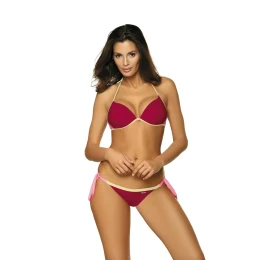 Podprsenka navržená pro střední a menší poprsí, vyztužená, s trvale umístěnou push-up výplní. Spolu s vertikálními kosticemi pevně spojuje prsa do dekoltu, pozvedá je a opticky zvětšuje. Vytváří smyslný výstřih. Ozdobné kontrastní lemování v horní části podprsenky přechází ve štíhlá ramínka, která se za krkem hezky zavazují. Lem s vsadkami v kontrastní šťavnaté barvě, vzadu zavázaný. Spodní díl bikin dokonale ladí s podprsenkou, je hladký a sexy zavazuje se na bocích, takže vypadá velmi žensky. V těchto plavkách budete na pláži určitě vyčnívat!